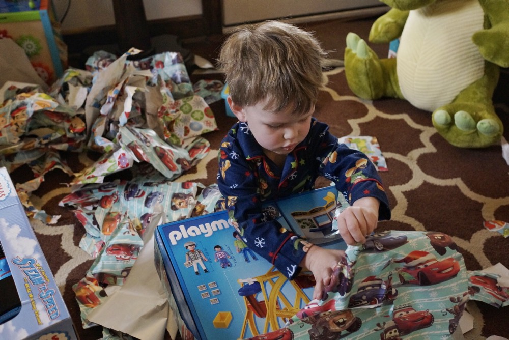 carefully tearing the wrapping paper